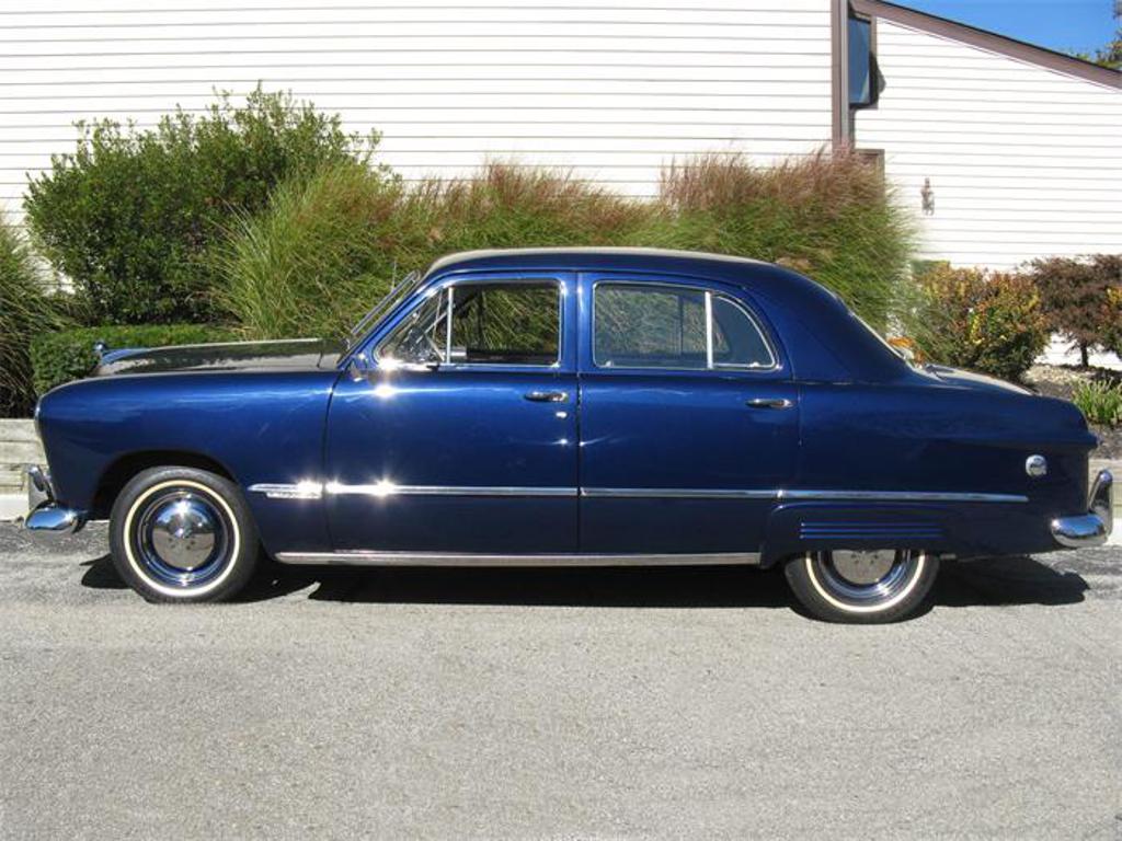 Dark blue metallic exterior ... 2-tone interior ... Beautiful chrome ... 239 cid flathead v-8 ... 3-speed manual ... Recently restored. Ford's 1949 Custom sedan was completely new from stern to helm, and it did not go without notice. Named "the car of the year," it combined several styling and engineering innovations that proved popular with american buyers. If you're looking for a cruiser with plenty of eye appeal that is ready to enjoy, look no further than this gorgeous 1949 Ford Custom. Finished in dark blue metallic, this car's fresh finish has a beautiful luster that is further enhanced by an abundance of chrome and brightwork that is in excellent condition. From its distinctive hood ornament to its chrome-tipped dual exhaust, this car shines! Its beautiful exterior color is echoed in the car's newly completed interior, which is finished in a handsome two-tone gray tweed and blue check pattern. The door panels, carpeting, and headliner were also recently completed, and show very nicely. The steering wheel and "flight panel" dash board are also in excellent condition. Under the hood you will find the original 239 cid flathead v-8 mated to a 3-speed manual transmission. Both the engine and transmission were recently rebuilt. Other mechanical improvements made when the car was professionally restored in 2011 include new brakes, brake lines, and tires. Its dual exhaust system features glass packs that give the car a nice rumble. Best of all, this Custom runs and drives as well as it looks. One item of note is that the radio is not currently functioning. In addition, minor imperfections in the finish do not detract from the overall appearance of this car. All receipts from the restoration will be provided to the next owner of this car. If a well running and driving late 1940s classic with plenty of sparkle is what you desire, this 1949 Ford Custom is the one for you!