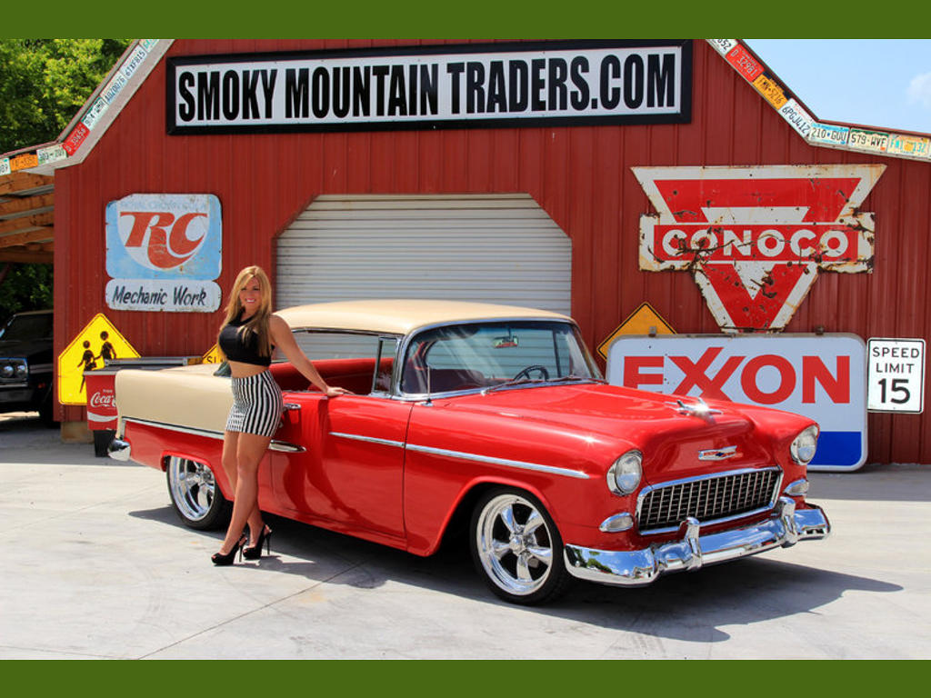 | Most all of our auctions end early call us for a great price up for sale we have a 1955 chevy Bel Air 2 door hard top. In '55 chevy came out with an all new body that was an instant hit. This was the first year for the small block v8 and the 12 volt. The one we have for you has had a complete make over with new floors, fresh paint, new interior, and a new crate motor. In the paragraphs to follow we will give a brief description of the exterior, interior, and heartbeat of the chevy, but first we would like to tell you a little about us. Smoky mountain traders is a classic car dealer in east tennessee. We are family owned, operated, and own our entire inventory, no consignments, and only deal in muscle cars and vintage auto. You can count on us to have 70 to 80 cars at all times. We don't have a big show room that our customers would otherwise pay for. So, that's how we can sell for less than other dealers. To contact us for more information, pictures, or any questions call our office at or visit our smokymountaintraders website. We will start off with the exterior of the Bel Air. When you walk around it you will see the panels are straight with good gaps. Everything is covered in a two tone paint scheme of red and cream that is base/clear coat. It has been buffed and polished to a deep rich shine. The stainless is all good and lines up well. At the time of the resto all the weather stripping was replaced as well as the seals around the glass. The bumpers were replaced as well as other chrome. To finish off the exterior look it's sitting on a new set of 18" and 20" american racing wheels and tires. Next, we will take a look at the interior of the '55. On the inside it's done in the factory style with vinyl seats and cloth inserts. All the vinyl is red with the cloth being tan. The column is a chrome tilt with a custom wheel. The dash and trim is painted red to match the exterior. Also when you look at the dash it has a set of new custom gauges and a vintage radio. The stainless bows on the headliner look like new. As a whole the interior is very neat and clean. Finally, we will take a look at the heartbeat of the chevy. Under the hood it has a new 350 crate engine that's dressed with a polished intake and valve covers. A new aluminum radiator was installed to keep it cool. The exhaust flows through new stainless headers and new dual exhaust. The trans is a turbo automatic. This '55 also has a new wiring harness from front to back along with new vintage heat and ac. It don't stop there, as it has a 605 box to give it power steering and yes it four wheel power disc brakes. When you look under this '55 it all appears to be a frame off resto with a new one piece floor pans and body braces. It has a new fuel tank and lines as well. If we can help you in any way with questions or a specific picture, you can call our office at . Or feel free to call daniel at, devvin at, or you can e-mail us at |