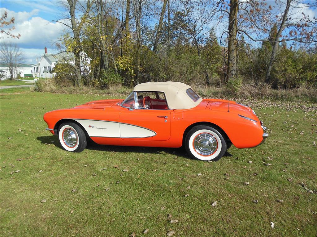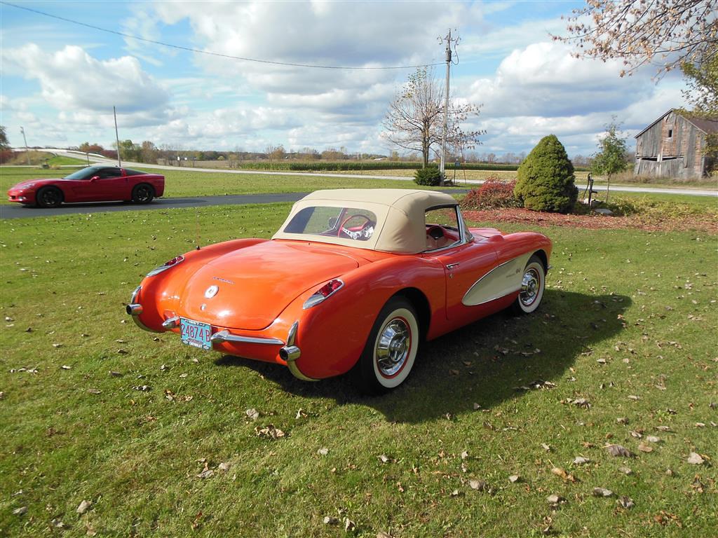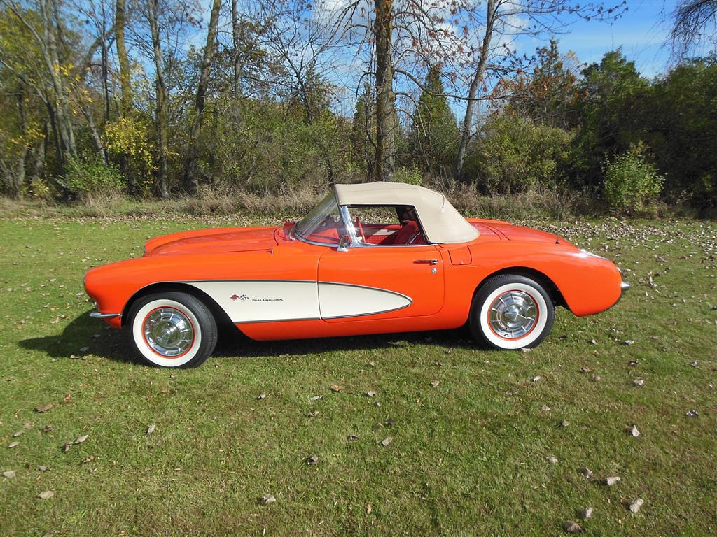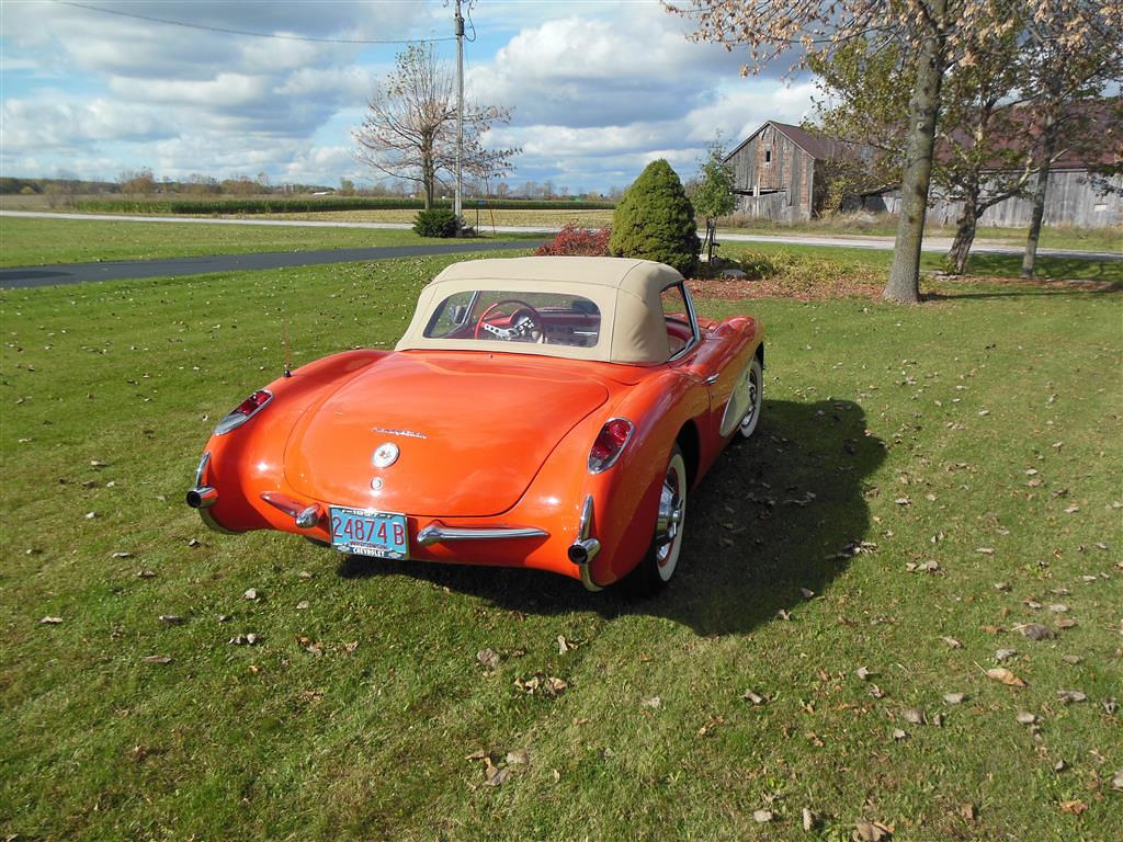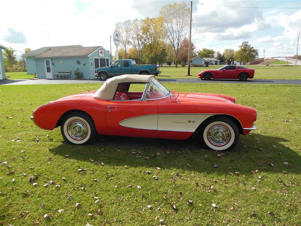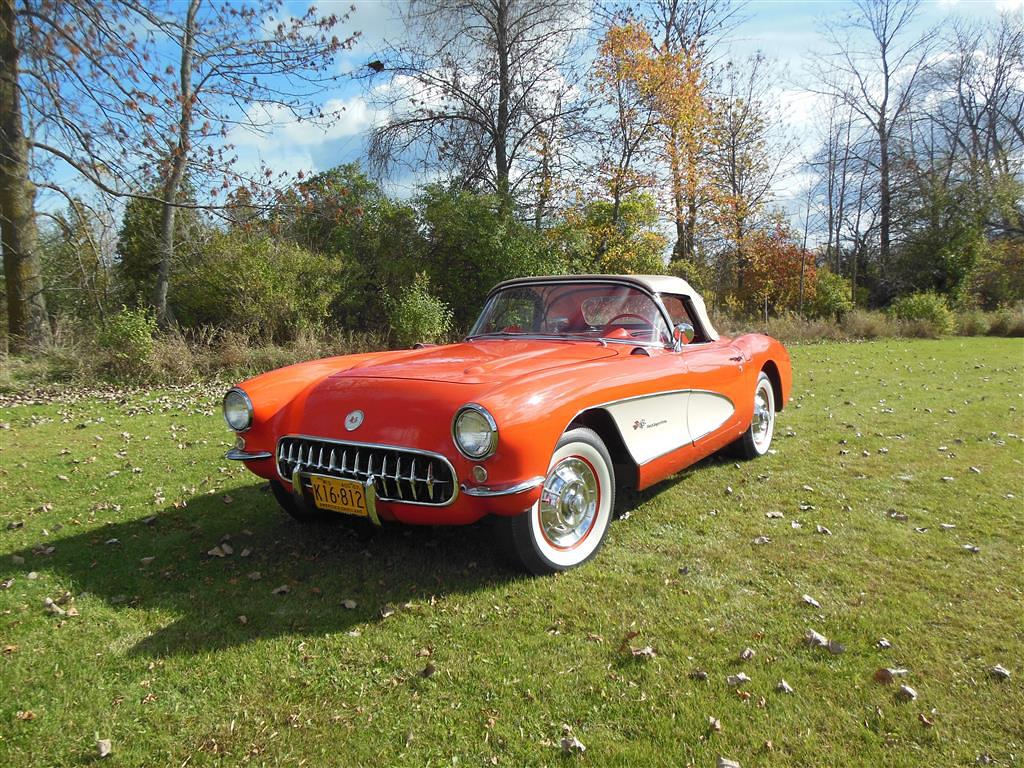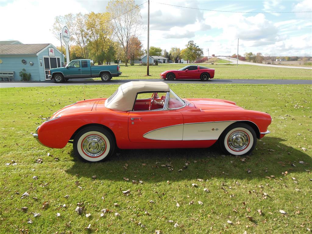 | All vehicle trades considered, including classics and performance. Here is a magnificent first generation Corvette. This 1957 fuel injected 3-speed has been with the same owner for the last 33 years. During his ownership this car received a full frame-off restoration that took ten years to complete, resulting in a truly beautiful Corvette inside and out, top and bottom. As the pictures show, this car is in excellent condition. The restoration was completed in 1990 and looks as good today as it did then, having been impeccably cared for and lightly driven since. During restoration the body was stripped down to bare fiberglass and repainted its original venetian red with beige coves, all in lacquer. The new soft top is beige as well and makes for a very handsome car, especially with the bias ply whitewall tires. There is also a matching red hard top with new red headliner. All chrome and moldings look fantastic, while the underside appears factory fresh with all correct markings. The red interior is also completely redone with all new upholstery. The dash was repainted the proper color, while all gauges work fine including the generator drive tachometer. The signal seeking wonderbar am radio also works properly. Glass is all original and in remarkable condtion. The heart of this Corvette is its fuel injected 283 cubic inch motor. The engine has been replaced but is the correct 3731548 casting with correct components. It is a 250 hp setup with 7014800 fuel injection unit and 1110906 distributor. It does have a modern spin-on oil filter, though the original cartridge setup is included. Note this car's vin gives it a build date of late july 1957. This car comes with all receipts dating to 1980. It has many new parts; brake lines, fuel lines, fuel tank, kingpins, shocks, wiring harness, et al. All original parts that were not too far gone are also included. This is one of the nicest 1957 Corvettes on the market. Everything has been done right and the level of detailing is outstanding throughout. Throw in the desirable color combination with the fuel injected 3-speed drivetrain and you really have something special. |