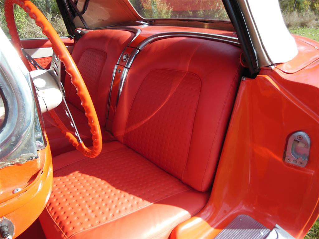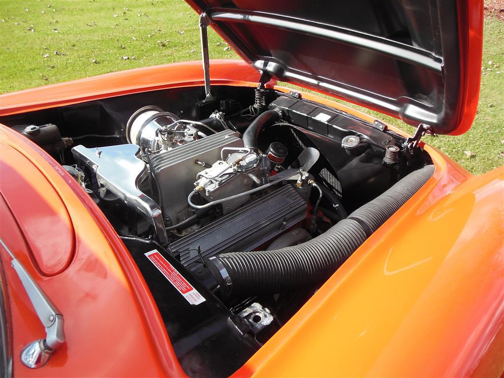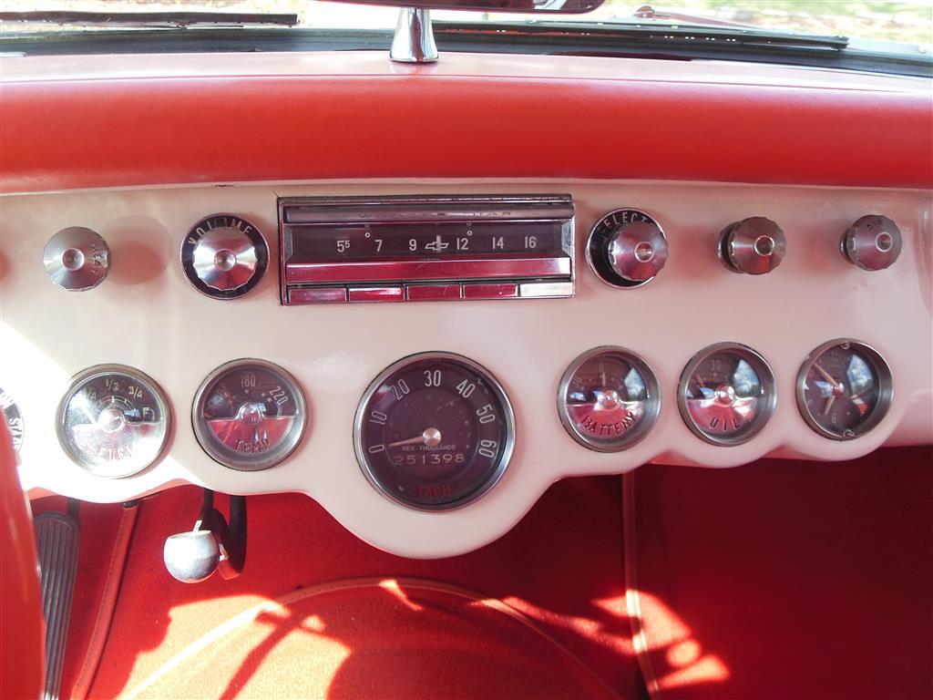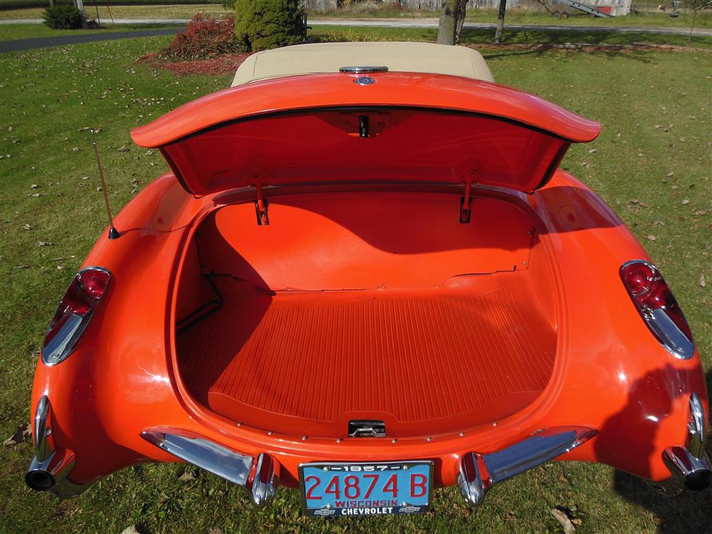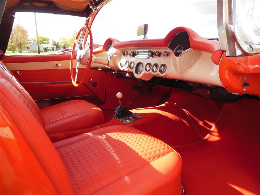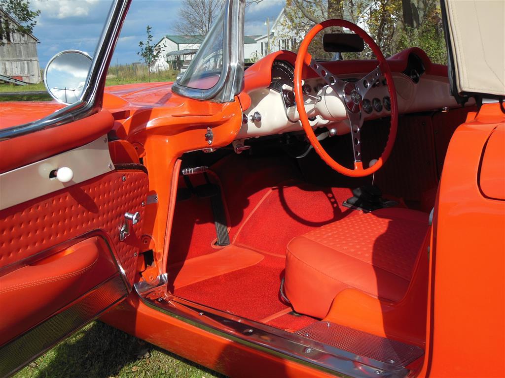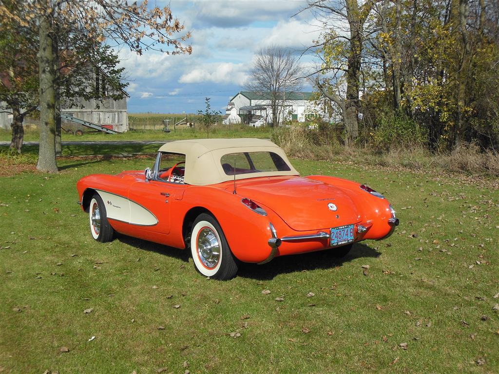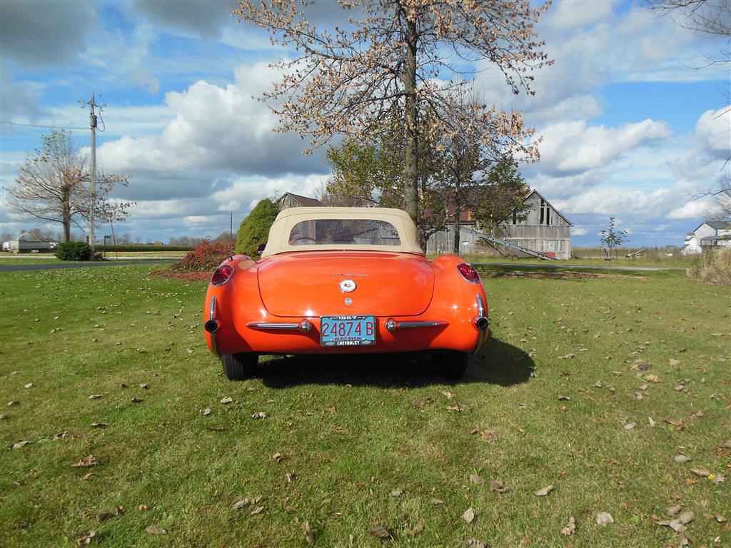 | All vehicle trades considered, including classics and performance. Here is a magnificent first generation Corvette. This 1957 fuel injected 3-speed has been with the same owner for the last 33 years. During his ownership this car received a full frame-off restoration that took ten years to complete, resulting in a truly beautiful Corvette inside and out, top and bottom. As the pictures show, this car is in excellent condition. The restoration was completed in 1990 and looks as good today as it did then, having been impeccably cared for and lightly driven since. During restoration the body was stripped down to bare fiberglass and repainted its original venetian red with beige coves, all in lacquer. The new soft top is beige as well and makes for a very handsome car, especially with the bias ply whitewall tires. There is also a matching red hard top with new red headliner. All chrome and moldings look fantastic, while the underside appears factory fresh with all correct markings. The red interior is also completely redone with all new upholstery. The dash was repainted the proper color, while all gauges work fine including the generator drive tachometer. The signal seeking wonderbar am radio also works properly. Glass is all original and in remarkable condtion. The heart of this Corvette is its fuel injected 283 cubic inch motor. The engine has been replaced but is the correct 3731548 casting with correct components. It is a 250 hp setup with 7014800 fuel injection unit and 1110906 distributor. It does have a modern spin-on oil filter, though the original cartridge setup is included. Note this car's vin gives it a build date of late july 1957. This car comes with all receipts dating to 1980. It has many new parts; brake lines, fuel lines, fuel tank, kingpins, shocks, wiring harness, et al. All original parts that were not too far gone are also included. This is one of the nicest 1957 Corvettes on the market. Everything has been done right and the level of detailing is outstanding throughout. Throw in the desirable color combination with the fuel injected 3-speed drivetrain and you really have something special. |